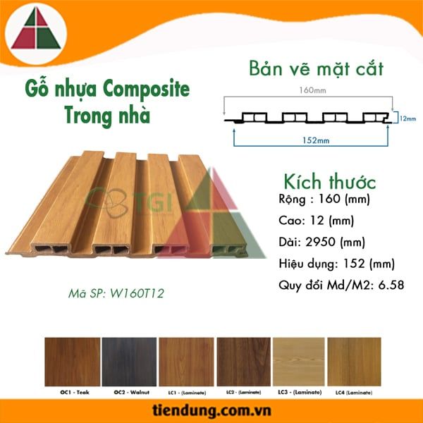 Gỗ Nhựa Composite Nội Thất W160T12 được sản xuất từ nhựa, bột gỗ và một số chất phụ gia khác trên dây chuyền công nghệ ép đùn có mẫu mã đa dạng, Tấm ốp composite nội thất được sản xuất bằng kỹ thuật riêng vừa có tính chất như gỗ tự nhiên và nhựa để đảm bảo yêu cầu cao trong thi công như: ốp trần, ốp tường...Đặc biệt bề mặt được phủ thêm một lớp Film nhựa PVC khó bong tróc với nhiều màu sắc phong phú nhằm đáp ứng sự đa dạng trong các thiết kế đa dạng khác nhau như: biệt thự, nhà phố, nhà hàng, khách sạn...