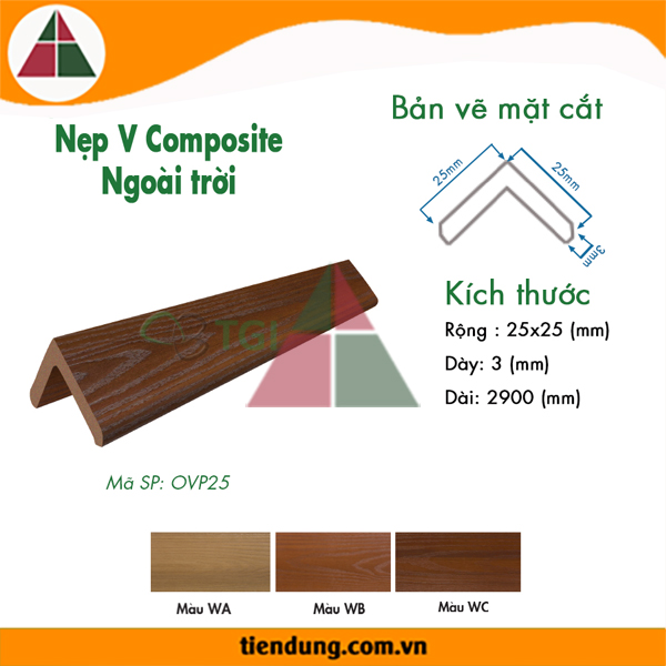 Nẹp Chữ V Ngoại Thất OVP25 là phụ kiện trang trí đi kèm tấm ốp nhựa composite ngoại thất, chuyên sử dụng cho Ngoại Thất như: ốp tường ngoài trời, ốp trần ngoài trời, Lamri ngoài trời…Bề mặt được phủ nhựa ASA giúp sản phẩm giữ được độ bề màu và độ bóng trong thời gian dài dưới tác động của thời tiết khắc nghiệt. Sản phẩm có rất nhiều tính năng ưu việt, giá thành lại rất rẻ, thi công nhanh, tuổi thọ cao.