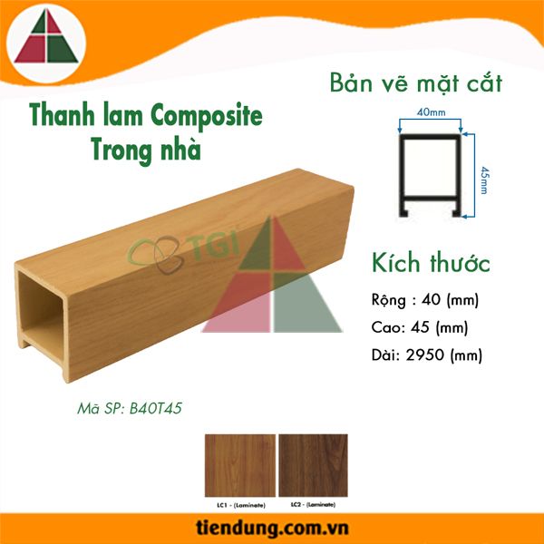 Thanh Lam Gỗ Nhựa B40T45 hay còn gọi là thanh hộp gỗ nhựa nội thất là sản phẩm được sản xuất từ nhựa, bột gỗ và một số chất phụ gia khác trên dây chuyền công nghệ ép đùn có mẫu mã đa dạng. Thanh Lam Gỗ Nhựa B40T45 được sản xuất bằng kỹ thuật riêng vừa có tính chất như gỗ tự nhiên và nhựa để đảm bảo yêu cầu cao trong thi công như: ốp trần, ốp tường,...Đặc biệt bề mặt được phủ thêm một lớp Film nhựa PVC khó bong tróc với nhiều màu sắc phong phú nhằm đáp ứng sự đa dạng trong các thiết kế đa dạng khác nhau như: biệt thự, nhà phố, nhà hàng, khách sạn...