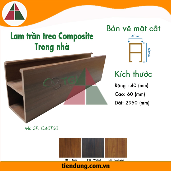 Thanh Lam Gỗ Nhựa C40T60 hay còn gọi là thanh hộp gỗ nhựa nội thất là sản phẩm được sản xuất từ nhựa, bột gỗ và một số chất phụ gia khác trên dây chuyền công nghệ ép đùn có mẫu mã đa dạng. Thanh Lam Gỗ Nhựa C40T60 được sản xuất bằng kỹ thuật riêng vừa có tính chất như gỗ tự nhiên và nhựa để đảm bảo yêu cầu cao trong thi công như: ốp trần, ốp tường,...Đặc biệt bề mặt được phủ thêm một lớp Film nhựa PVC khó bong tróc với nhiều màu sắc phong phú nhằm đáp ứng sự đa dạng trong các thiết kế đa dạng khác nhau như: biệt thự, nhà phố, nhà hàng, khách sạn...